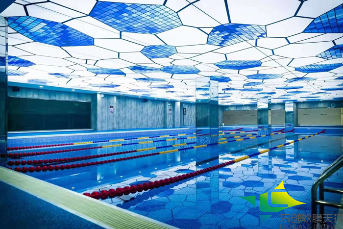 熱烈祝賀我公司徐州游泳館泳池防潮軟膜天花吊頂安裝順利完工并交付客戶使用,此泳池吊頂材料采用我公司高清UV精印防潮天花膜材,內(nèi)藏防水LED光源,透光效果,亮度高無需再做其他照明設備,整體頂面全部采用我公司專用防潮膜材,安裝效果得到了客戶的滿意,提高了整體裝飾檔次。 實際安裝效果如下圖: